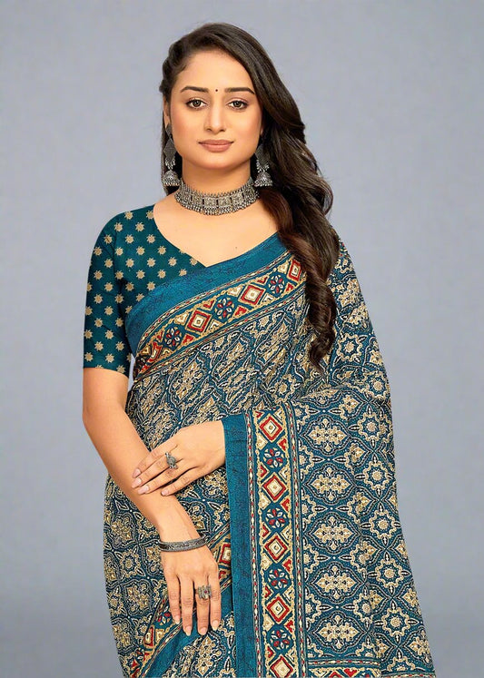 Ajrakh Design Teal Crepe Saree with Printed Border