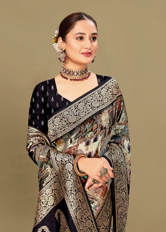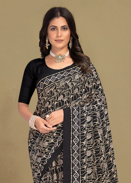 Art Cotton Silk Saree in Black with Floral Prints and a Bold Solid Border