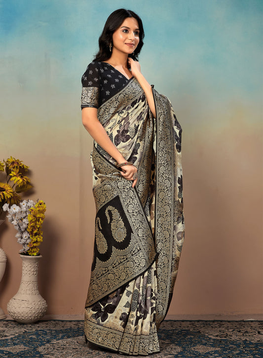 Floral Digital Printed Cream Georgette Saree with Zari Woven Borders and Graceful Butta
