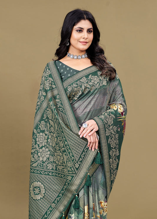 Grey Green Pure Tussar Silk Saree with Floral Digital Prints, Intricate Zari Border, Butta Motifs and Tassel Accents