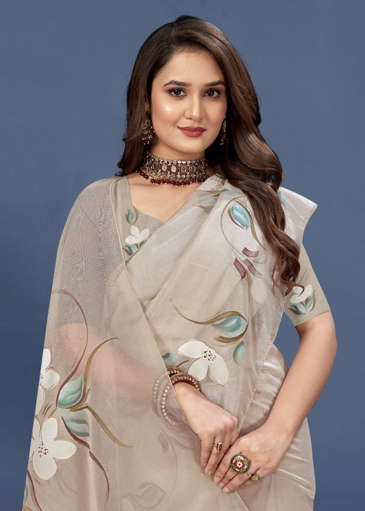Hand-Painted Floral Organza Saree in Pale Brown with Foil Accents and Tassel
