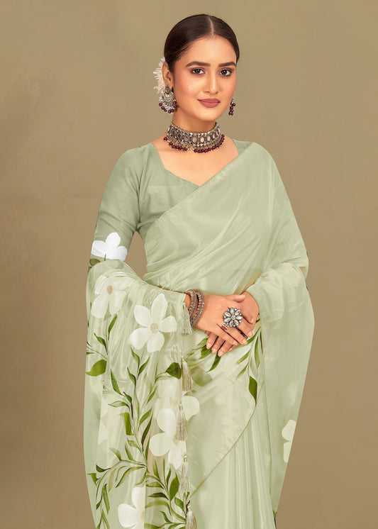 Mint Green Organza Saree with Hand-Painted Floral Designs, Glittering Crystal Work and Tassels