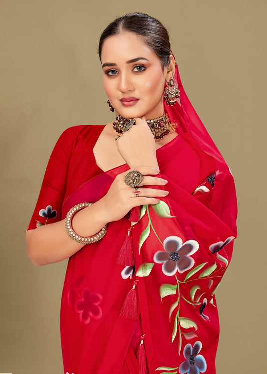 Red Organza Saree Adorned with Crystal Highlights, Hand-Painted Florals, and Tassel Trims