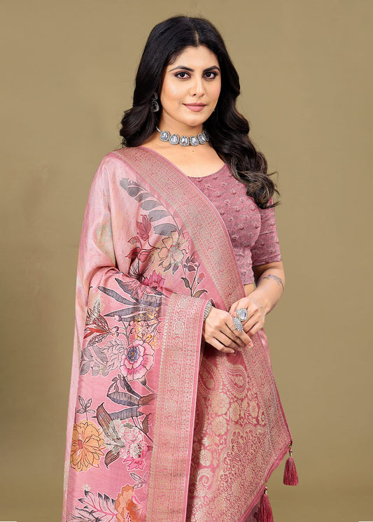 Rose Pink Pure Tussar Silk Saree with Floral Digital Prints, Lustrous Zari Border, Butta, and Flowing Tassels