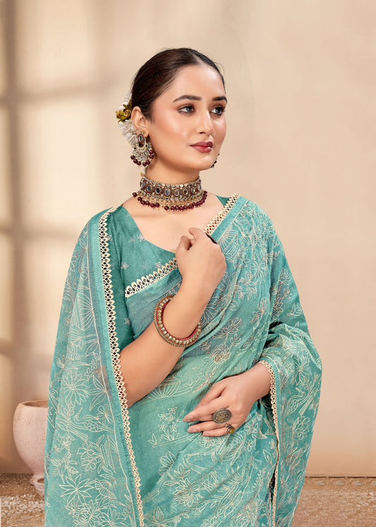 Sky Green Organza Saree with Crushed Finish, Embroidery Thread Work and Crochet Less Border