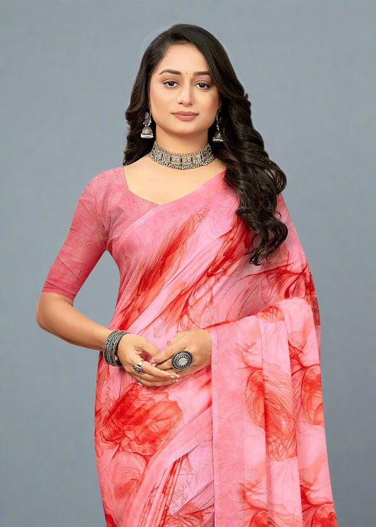 Vibrant Rose Pink Abstract Floral Chiffon Designer Saree