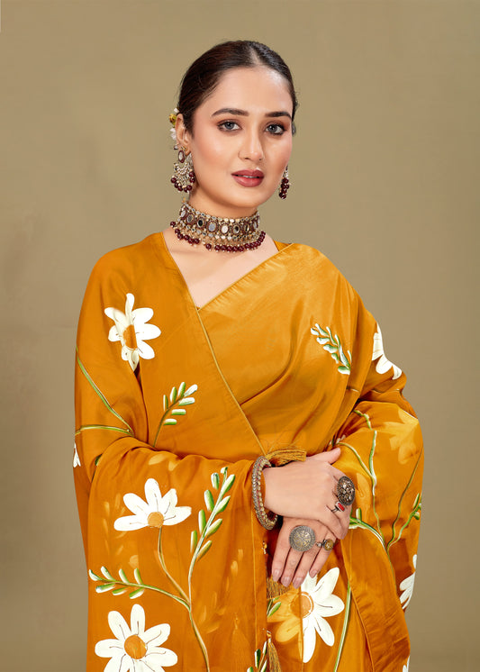 Luxurious Gold Satin Organza Saree with Artistic Floral Hand Painting and Shimmering Foil Highlights