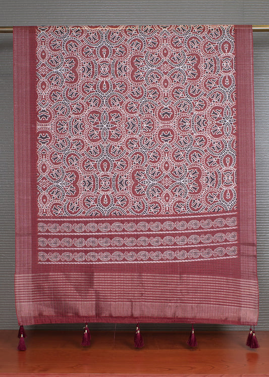 Ajrak Digital Printed Rust Linen Dupatta with Tassel Accents