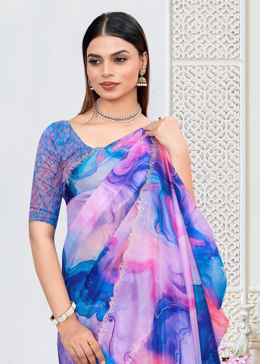 Digital Abstract Print Multicolor Organza Saree with Elegant Stone-Studded Border