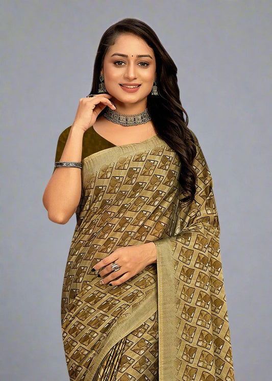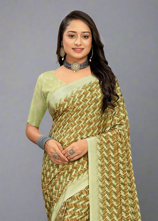Georgette Mehndi Green Saree with Eye-Catching Geometric Abstract Prints