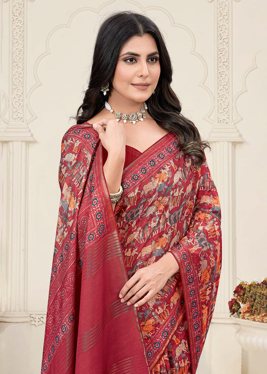 Rich Maroon Tussar Silk Saree Featuring Pichwai Prints, Zari Accents, and Chit Pallu