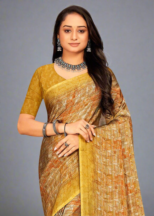Geometric Abstract Design on Mustard Brown Georgette Fabric Saree