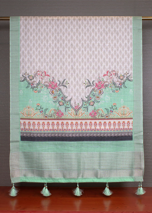 Sky Green Linen Dupatta Featuring Kalamkari Digital Prints and Tassels