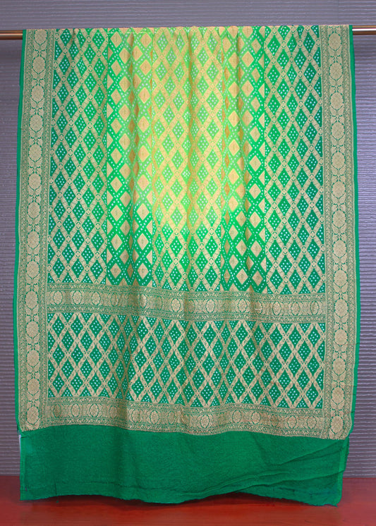 Exquisite Emerald Green Bandhej Georgette Dupatta with Intricate Handwoven Zari Border and Jaal Weaving