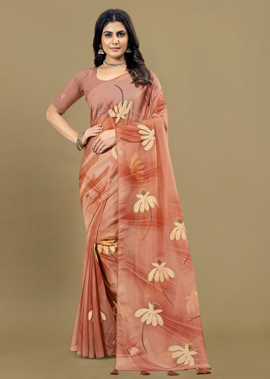 Hand-Painted Floral Organza Saree in Pale Brown with Foil Accents and Tassel