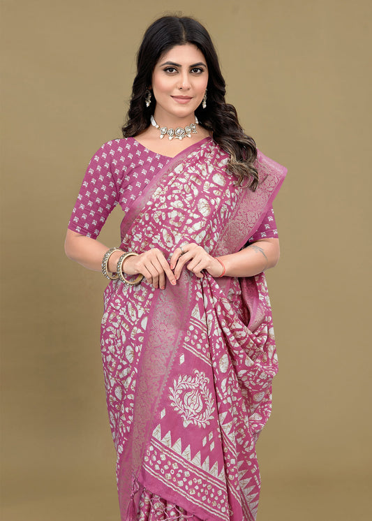 Mauve Pink Cotton Saree with Delicate Floral Prints, Foil Highlights, and Zari Woven Trim