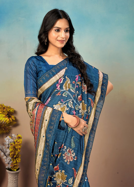 Tussar Silk Saree in Teal with Artistic Kalamkari Digital Prints and Exquisite Aari Work