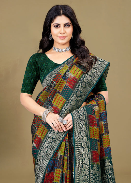 Bottle Green Organza Saree Showcasing Lush Floral Designs, Ornate Zari Border, and Intricate Zari Embellishments