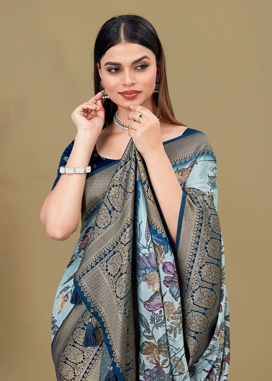 Indigo Blue Satin Silk Saree with Artistic Leaf Prints, Woven Zari Border, and Delicate Buttis