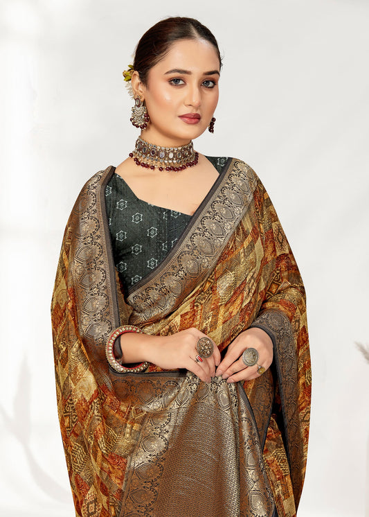 Multicolor Georgette Saree with Ethnic Digital Prints, Elegant Zari Woven Borders, and Butta