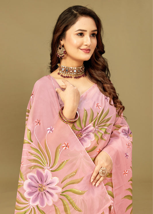 Charming Rose Pink Organza Saree with Artistic Hand-Painted Floral Motifs, Foil Work and Flowing Tassels