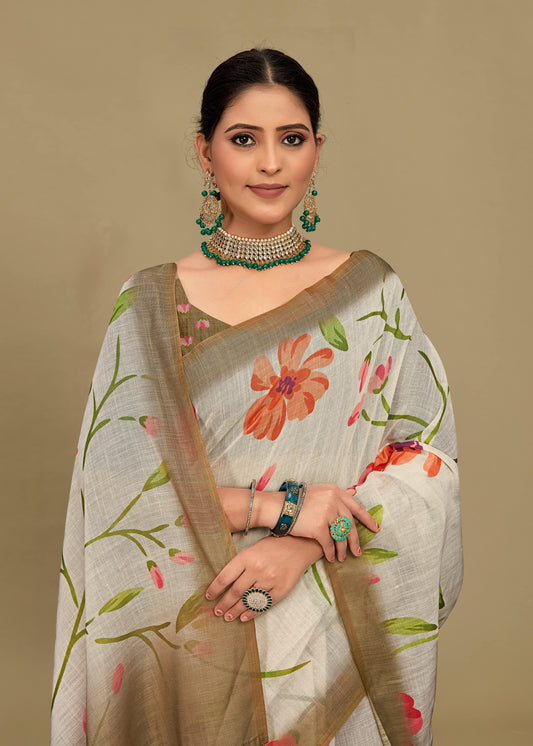 Floral Cream Linen Silk Saree with Zari Woven Border and Elegant Tassels