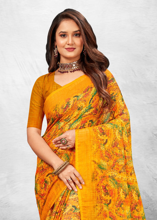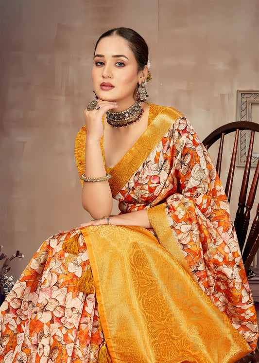 Graceful Orange-Yellow Saree with Bold Floral Prints, Luxurious Zari Borders and Butta Work