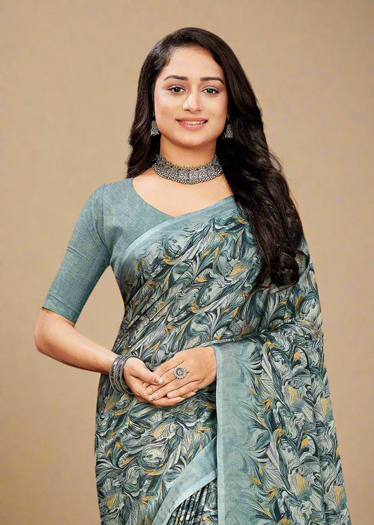 Indigo Blue Satin Silk Saree with Artistic Leaf Prints, Woven Zari Border, and Delicate Buttis