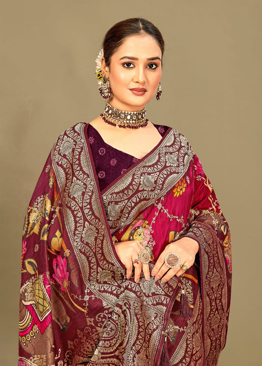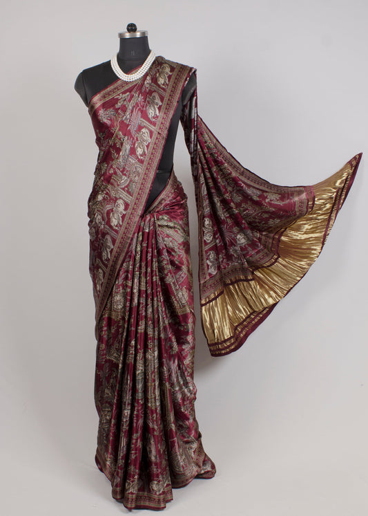 Maroon Gajji Silk Saree Featuring Ethnic Prints and a Classic Lagdi Patto Design