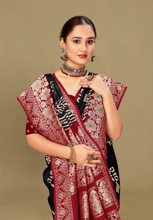 Luxurious Black Fine Silk Saree with Zari Weave, Aari Printed Blouse, and Tassels