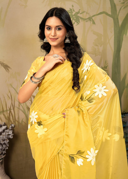 Luxurious Gold Satin Organza Saree with Artistic Floral Hand Painting and Shimmering Foil Highlights