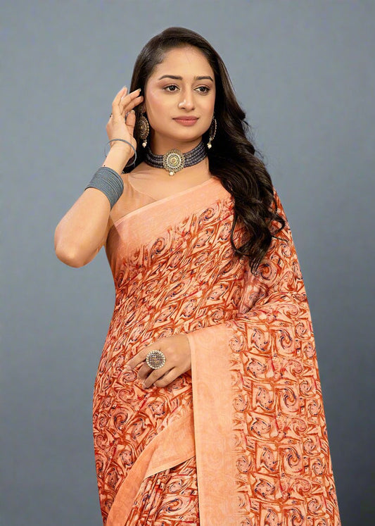 Chiffon Designer Saree with Peach Abstract Floral Print
