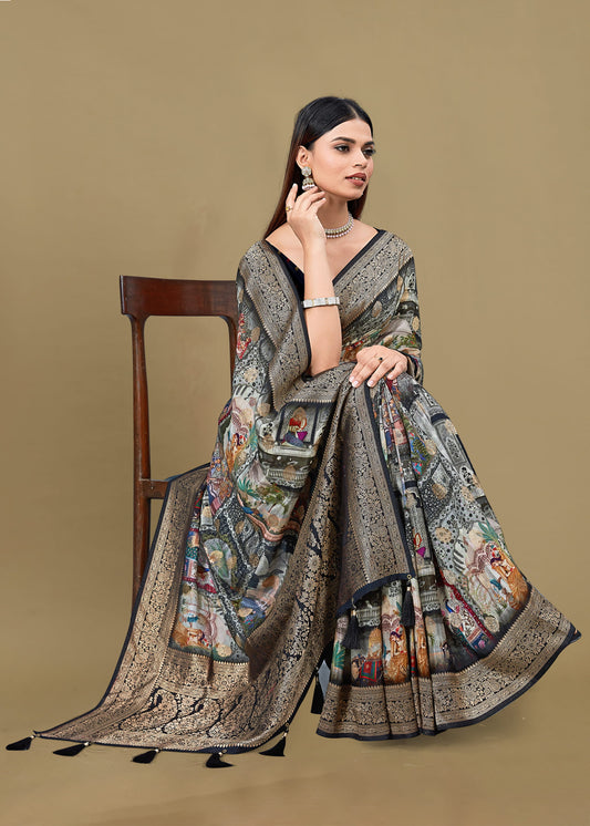 Black Ikat Printed Satin Silk Saree with Rich Zari Woven Border and Butti Details