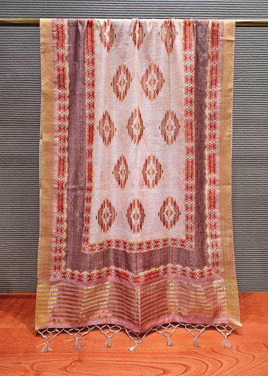 Peach Ikat Printed Zari Woven Border Linen Dupatta