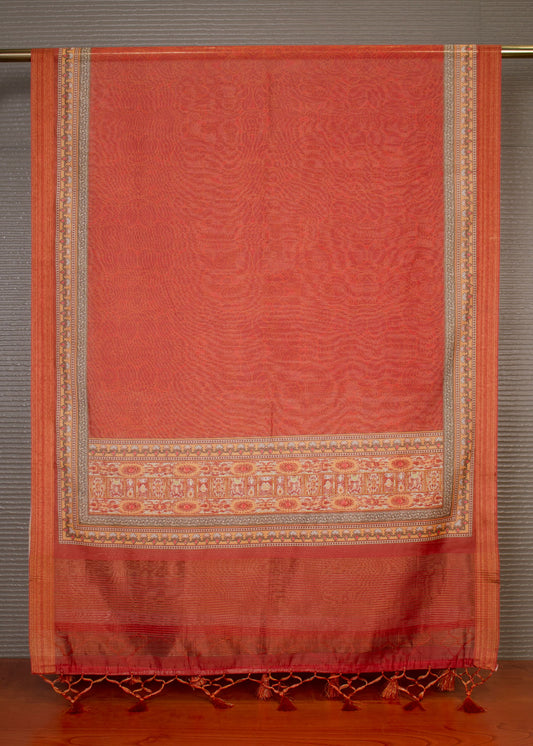 Ethnic Motif Printed Red Orange Hard Linen Dupatta with Zari Woven Border and Graceful Tassels