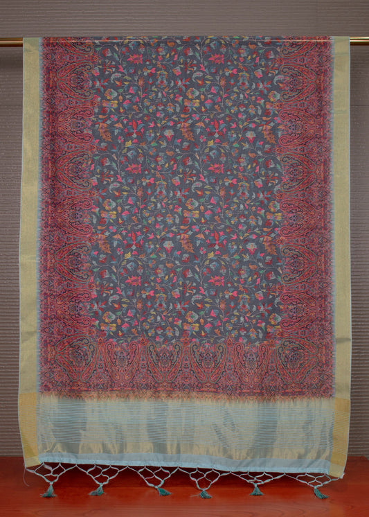 Teal Kashmiri Digital Printed Dupatta in Soft Linen Adorned with Zari Woven Border and Tassels