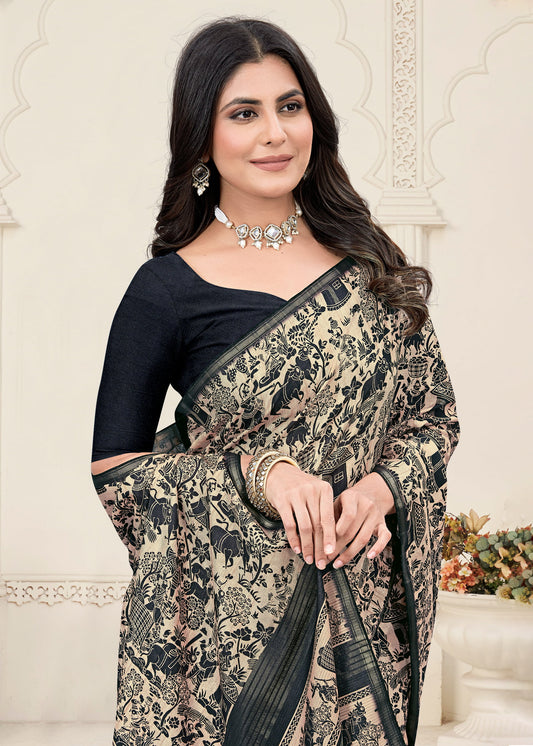 Pure Black Tussar Silk Saree Adorned with Ethnic Digital Prints, Luxe Zari Woven Border and Tassel